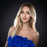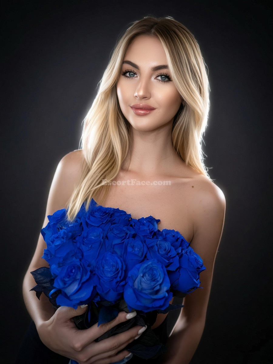 Delicate features, flawless fair skin, natural white-blonde hair and bright blue eyes that feel almost unreal. Her slim waist and perfectly balanced proportions create a silhouette that is both elegant and breathtaking.